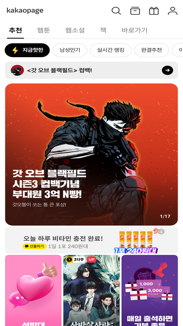 74%오리지널 독점 웹툰, 웹소설 부터 책 까지 한 곳에서 즐기세요. 인기 콘텐츠가 기다리면 무료!