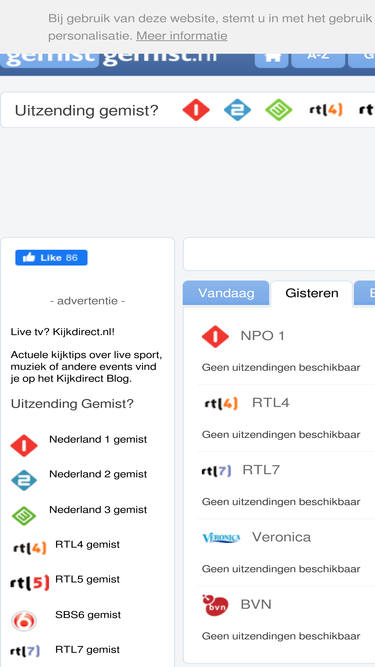 78%uitzending gemist? bekijk hier alle uitzendingen terug van npo 1, 2, 3, rtl 4, 5, 7, 8, veronica, sbs, net 5... op hebikietsgemist.nl vind je alle gemiste uitzendingen...