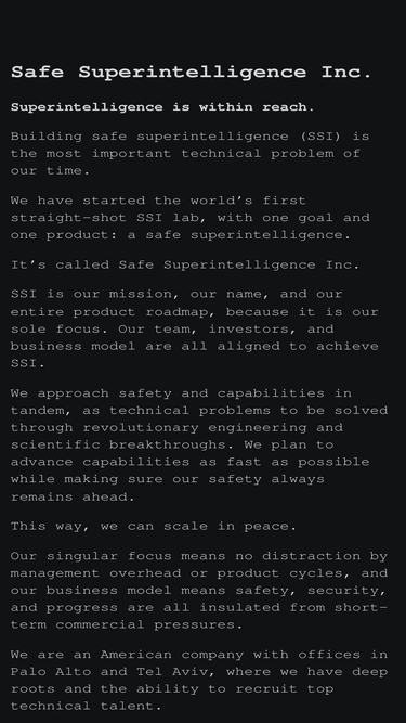 79%The world's first straight-shot SSI lab, with one goal and one product: a safe superintelligence.