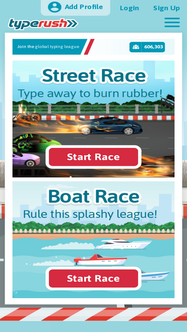 90%race your friends by typing fun facts! analyze and practice your tricky keys to improve your wpm! enter the country leaderboards to show off your skills. the best online typing race game.
