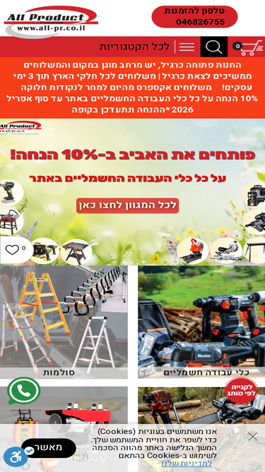85%אול פרודוקט עוסקת באספקת כלי עבודה, כלי גינון וציוד טכני לבית ולעסק משלוח מהיר עד 3 ימי עסקים לכל רחבי הארץ, מחיר מהיבואן לצרכן. הכנסו לאתר :)