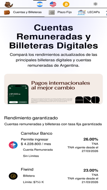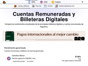 82%Compará las mejores tasas de cuentas remuneradas y billeteras digitales en Argentina. Encontrá rendimientos competitivos para tu dinero con condiciones especiales.