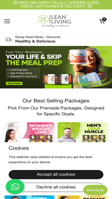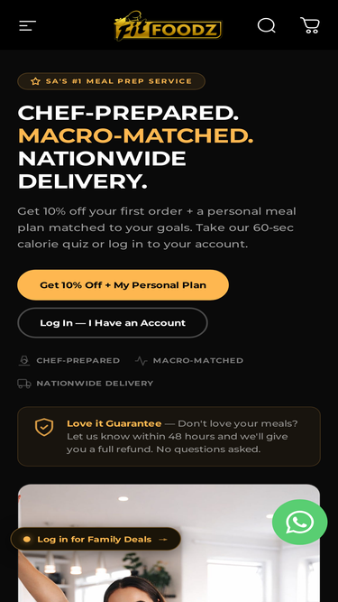 89%Men's Weight Loss Package Burn fat. Keep muscle. Eat properly. Portion-controlled, high-protein meals that make cutting straightforward. Stay in a deficit without feeling hungry or losing strength. Fully chef-prepared, macro-tracked, and ready in minutes — just heat and eat. AVG PER MEAL 40.6g Protein · 40.3g Carbs · 8.6g Fat · ~398 Cal A-Grade Rump Steak Premium proteins only Skin-Pack Technology BPA-free, freshness sealed Cold Chain Delivery WC & Gauteng depots MyFitnessPal Ready Barcode on every meal CONSISTENCY MADE SIMPLE No willpower battles, no calorie counting, no cooking. The hardest part of any diet is staying consistent — and that problem is solved when every meal is already done for you. What's Inside — 15 Meals Lean Mince, Brown Rice, Corn & Baby Carrot 369.1 kcal P 36.0g C 40.9g F 6.9g Lean Mince, Sweet Potato Mash & Roasted Butternut 357.5 kcal P 34.9g C 36.6g F 8.0g Lean Mince, Sweet Potato, Peas & Corn 408.9 kcal P 39.1g C 50.1g F 6.2g Steak Strips, Stir Fry & Brown Rice 427.8 kcal P 40.3g C 36.1g F 13.2g Lean Mince, Brown Rice & Roasted Veg 402.6 kcal P 36.4g C 46.4g F 6.6g A-Grade Rump Steak, Quinoa & Butternut 441.5 kcal P 40.7g C 32.2g F 16.3g A-Grade Rump Steak, Sweet Potato Mash & Broccoli 455.1 kcal P 40.9g C 40.1g F 14.7g Chicken Fillet, Brown Rice & Butternut 373.7 kcal P 40.5g C 37.9g F 7.3g Chicken Fillet, Gem Squash, Brown Rice & Mix Veg 371.2 kcal P 41.0g C 39.8g F 5.3g Chicken Fillet, Quinoa & Roast Veg 371.1 kcal P 42.3g C 36.2g F 6.2g Chicken Fillet, Roasted Butternut, Quinoa & Broccoli 395.6 kcal P 45.2g C 42.9g F 6.3g Chicken Fillet, Spinach, Quinoa & Roasted Veg 414.1 kcal P 45.8g C 38.9g F 9.2g Chicken Fillet, Sweet Potato & Broccoli 383.7 kcal P 43.3g C 44.6g F 5.0g Chicken Fillet, Sweet Potato Fries & Roasted Cauliflower 408.7 kcal P 41.1g C 39.4g F 11.2g Chicken Fillet, Sweet P