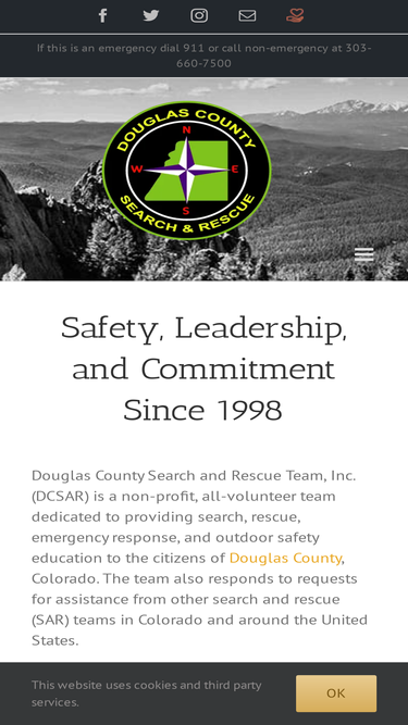 99%We publish a monthly team newsletter -- check it out, subscribe, donate or volunteer. Subscribe Past Issues RSS Translate Belay On! The Official Newsletter of Douglas County Search and Rescue Celebrating 20 Years of Community Service May 2018