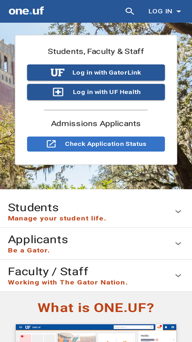 79%university of florida - one.uf is the university's mobile-friendly portal for accessing self-service functionality. one.uf student services include schedule of courses, registration, drop/add, my schedule, transcripts, and degree audit. as we work to modernize our information systems, one.uf will become the 'one-stop shop' for student self-service and will serve as a self-service portal for faculty who interact with student information.