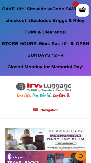 88%Irv's Luggage has been the #1 resource for top quality luggage, backpacks, travel accessories and more, in the Chicagoland area since 1947. You'll find the best brands in the business, including Briggs & Riley, Tumi, Travelpro, Osprey, Travelon and others. We do luggage repair for all major brands.