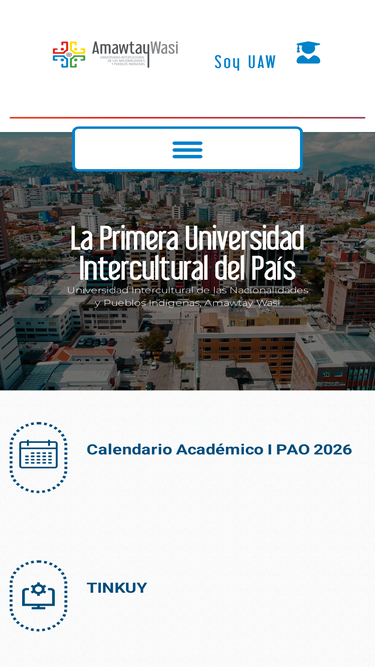85%Nuestras carrerasÑukanchikpa yachanakuna II PERIODO 2025 Próximo Inicio de Clases 10 Carreras de Pregrado 1609 Estudiantes Oferta académica Ima yachaykuna Pushak kamaywasika mushuk yuyay charik paktayachay ñantami rurashka, kay yachayka pushay wakiwan tinkiri llamkaytami charin. Hatun Yachanawasika hamutanmi paypa llamkayka ayllullakyakunata mushukyachinkapak tawka yachaykunata paykunapa makipi churana. Chaymantami ayllullaktakunawan alli llamkak yachakuyta tantachin. La Universidad Amawtay Wasi ha desarrollado un diseño curricular innovador centrado en la vinculación con la sociedad como su eje principal. Reconociendo que su función primordial en la sociedad es poner al servicio de la misma una variedad de saberes con el objetivo de transformarla, la Universidad se organiza como un sistema educativo socialmente responsable. Nuestras carreras de pregrado Ñukanchik ñawpa yachanakuna Planning Leather detail shoulder contrastic colour contour stunning silhouette working peplum. Learn More Carrera de Pedagogías Interculturales y Etnoeducación En un mundo cada vez más diverso y globalizado, la educación intercultural se ha convertido en un pilar fundamental para construir sociedades inclusivas y respetuosas de las diferencias. Ver más Carrera de Lengua y Cultura Esta carrera estudia la relación inseparable entre la lengua y la cultura, orientada a la generación de múltiples formas de promoción, difusión y protección de las culturas, las lenguas y hablas de los diversos grupos socioculturales del país. Ver más Carrera de Gestión Comunitaria del Agua La carrera se orienta a formar profesionales que aborden los desafíos alrededor de la gestión del agua, integrando las cuestiones sociales, económicas, culturales y ambientales de los territorios de las nacionalidades y pueblos indígenas, afroecuatorianos y montubios. Ver más Planning Leather detail shoulder contrastic colour contour stunning silhouette working peplum. Learn More Carrera de Agroecología y Soberanía Alimenta
