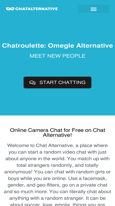 93%Chat Alternative is an Anonymous random video chat with over 5.000.000 strangers. No Sign-Up Required! Free cam chat on Chat Alternative app.