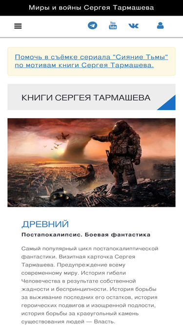 официальный сайт писателя-фантаста сергея тармашева. книги в жанрах: боевая фантастика, фэнтези, попаданцы, постапокалипсис. в книгах: магия, приключения, любовь, сталкеры, маги, космос, апокалипсис, выживание в подземных бункерах после ядерной войны, рыцари, эльфы, боевик, спецназ, зомби, драконы, подвиги. скачать электронные книги в формате fb2