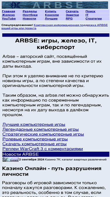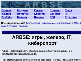 99%arbse - авторский сайт, посвящённый играм, железу, it. обзоры, статьи, прохождения, советы, faq собственного написания. на сайте есть раздел железа, закачки игр, программ, реплеев, карт и многого другого. в зоне особого внимания всегда находятся world of tanks, warcraft 3, diablo 3 и diablo, heroes 3, oblivion, skyrim - особые игры, требующие особого рассказа.