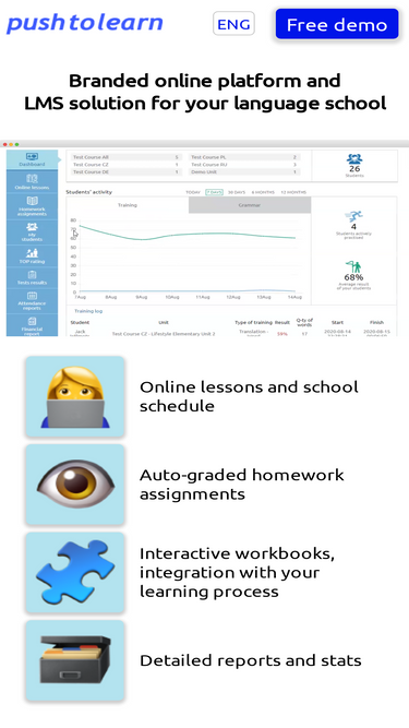 74%blended learning, flipped classroom and gamification. branded online platform for your language school