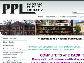 83% Welcome to the Passaic Public Library! We are pleased to announce EXPANDED hours of operation at the Reid Branch. Reid Branch is now open an additional evening hour daily. New hours: 1:00 p.m. - 6:00 p.m. Monday-Friday Passaic Public Library open positions: Full-time Librarian I Part Time Building Maintenance Worker For more information please click "Career Opportunities" below. Hours of operation at Forstmann: Mondays: 9:00 a.m. - 8:00 p.m. Tuesdays: 9:00 a.m. - 8:00 p.m. Wednesdays: 9:00 a.m. - 8:00 p.m. Thursdays: 10:00 a.m. - 6:00 p.m. Fridays: 10:00 a.m. - 6:00 p.m. Sundays: 12:00 p.m. - 5:00 p.m.