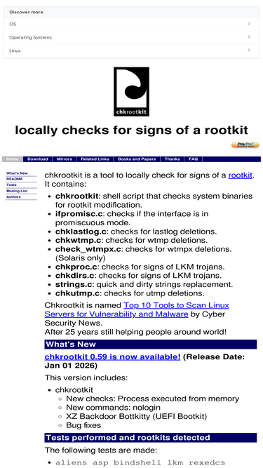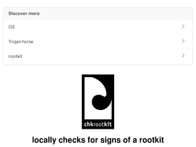 99%chkrootkit locally checks for signs of a rootkit. includes ifpromisc.c to check if the interface is in promiscuous mode, chklastlog.c and chkwtmp.c to check for lastlog and wtmp deletions and chkproc.c for signs of lkm trojans.