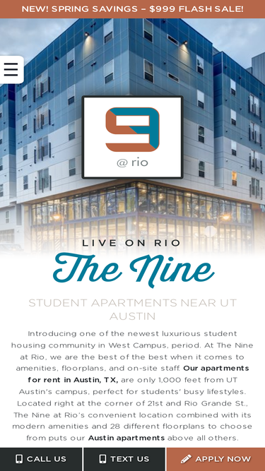 100%The Nine at Rio offers a wide variety of floor plans suited for every UT Austin student's needs. Contact us today to schedule a tour!