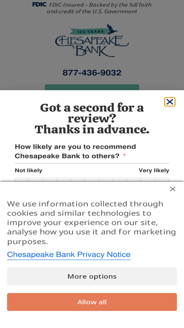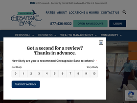 80%Thank you! Please check your email now Thanks for dropping us a line. One of our local banking experts will reach out to you in the next business day or two. We’re all ears to hear about your banking needs. – Chesapeake Bank BACK TO HOME PAGE