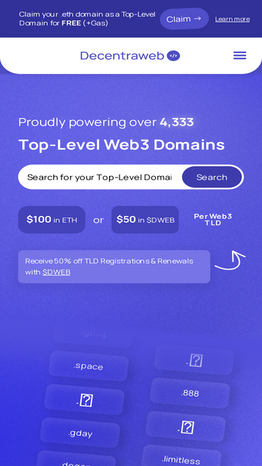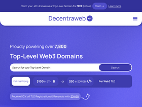 85%Register Web3 Domains and Blockchain Domains with Decentraweb. Secure your Top-Level Web3 Domain, register Web3 Domains and be your own Web3 Domain Registrar