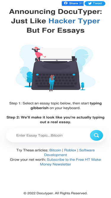 68%DocuTyper makes it look like you're actually typing an essay on any topic you choose. Enter an essay topic and just start typing, we'll take care of the rest ;)