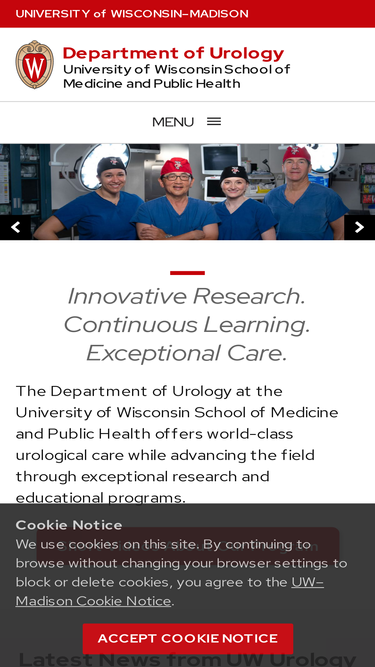 89%Innovative Research. Outstanding Care. The Department of Urology at the University of Wisconsin is a leading academic program offering comprehensive multidisciplinary urologic care in conjunction with innovative research, teaching, and learning opportunities. The Department of Urology is typically rated as a top program in adult urology by US News and World Report. In fact this…