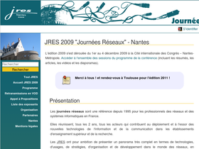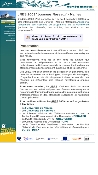 79%jres 2009 "journées réseaux" - nantes l’édition 2009 s'est déroulée du 1er au 4 décembre 2009 à la cité internationale des congrès – nantes-métropole. accéder à l'ensemble des sessions du programme de la conférence (incluant les résumés, les articles, les vidéos et les diaporamas). merci à tous ! et rendez-vous à toulouse pour l'édition 2011 !