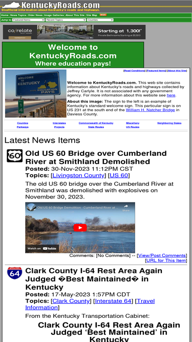 information about roads, streets, highways, bridges, and tunnels in the commonwealth of kentucky. includes photographs, history, and current information.