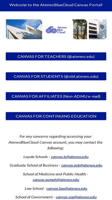 82%For any concerns regarding accessing your AteneoBlueCloud Canvas account, you may contact the following: Loyola Schools - canvas.ls@ateneo.edu Graduate School of Business - canvas.gsb@ateneo.edu School of Medicine and Public Health - canvas.asmph@ateneo.edu Law School -