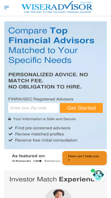 76%WiserAdvisor.com is an independent and unbiased matching service that helps individuals find the best financial advisors for their unique needs, and to provide financial advisors with their ideal clients. WiserAdvisor is a high-quality fit for both investors and advisors to reach their financial goals.