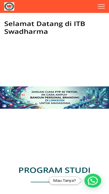 89%PROGRAM STUDI Akuntansi (S1) READ MORE Sistem Informasi (S1) READ MORE Teknik Informatika (S1) READ MORE Sains Data (S1) READ MORE Bisnis Digital (S1) READ MORE SPADA ITB Swadharma Sistem Pembelajaran Daring Pendaftaran Mandiri Pendaftaran Mahasiswa Baru Portal Mahasiswa Sistem Informasi Mahasiswa Jurnal Elektronik ITBS Kumpulan Jurnal ITB Swadharma Portal