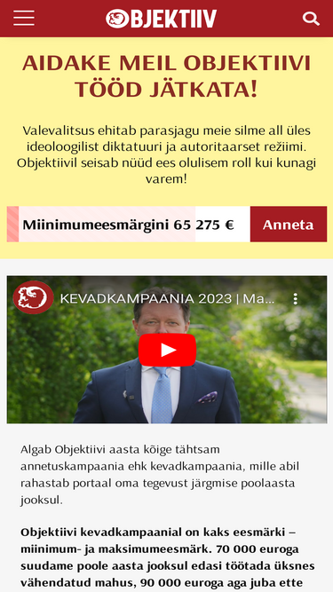 82%Uudiste- ja arvamusportaal Objektiiv on SA Perekonna ja Traditsiooni Kaitseks asutatud konservatiivne meedium, mis lähtub eesmärgist kajastada ühiskonnas toimuvat ausalt ja omakasupüüdmatult ning meie kultuuri alusväärtusi austavalt.