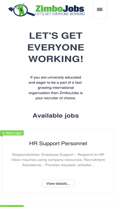 79%We are the exclusive recruitment website for ZimWorX. Our goal is to provide employment opportunities for talented, educated, and motivated Zimbabweans. Join our dynamic team today!