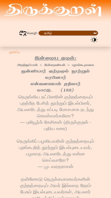 86%Thirukkural.net has translations of Thirukkural (திருக்குறள்) in various languages and attempt to provide as much information as possible that is known to us.