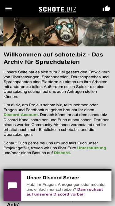 100%schote.biz sammelt sprachpatches, sprachdateien, languagechanger und deutschpatches für alte & neue spiele. wir bieten übersetzungen für sprachausgaben, untertitel und ingame-texte an. außerdem bieten wir erstellern an so ihre sprachdateien zu verbreiten.