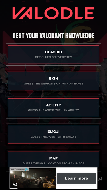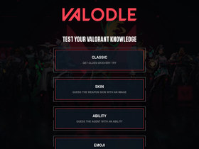 93%Valdle is free-to-play daily Valorant quiz game. Guess between 3 game modes involving weapon skins, agent quotes and ability icons. Build daily streaks to compete with friends!