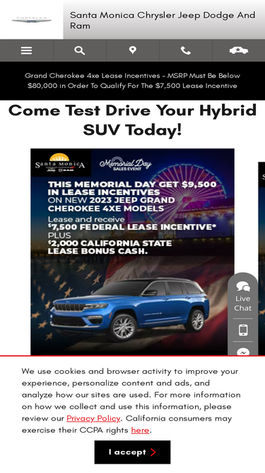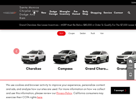 80%visit santa monica chrysler dodge jeep ram for a variety of new and used cars by chrysler, dodge, jeep and ram in the santa monica area. our chrysler, dodge, jeep and ram dealership, serving beverly hills, marina del ray, playa vista, malibu, west hollywood, el segundo and west los angeles, is ready to assist you!