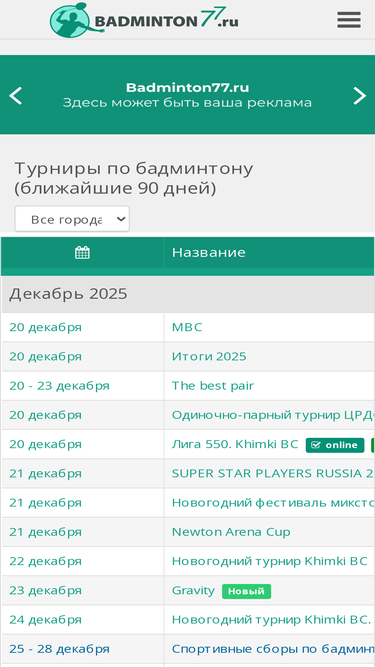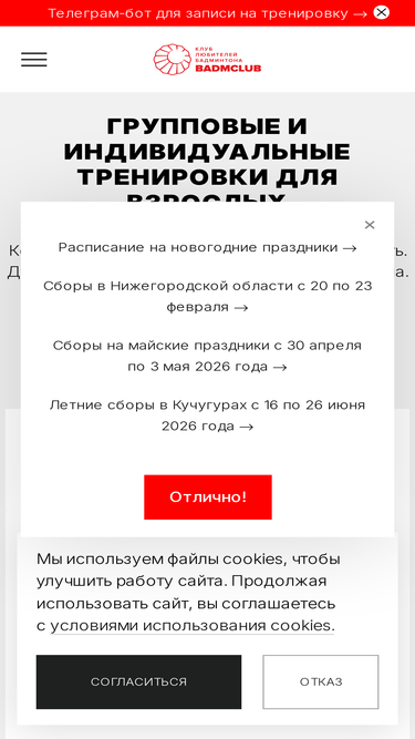 76%Групповые и индивидуальные тренировки для взрослыхКомбинации с воланом на общую выносливость. Для начинающих обучение основам бадминтона. Тренировка 30% игра на счет 70%Перейти Сентябрьские сборы по бадминтону Мы приглашаем Вас на сборы по случаю 16-го Дня Рождения BadmClub. Сборы пройдут на излюбленной базе «Солнечная на Оке» с 5 по 7 сентября 2025 года. » Каждый год