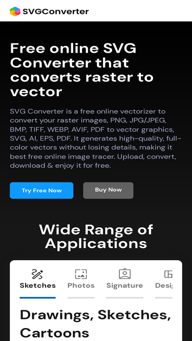 94%SVGConverter is a free online vectorizer to convert your raster images, PNG, JPG/JPEG, BMP, TIFF, WEBP, AVIF, PDF to vector graphics, SVG, AI, EPS, PDF. It generates high-quality, full-color vectors without losing details, making it best free online image tracer. Upload, convert, download & enjoy it for free