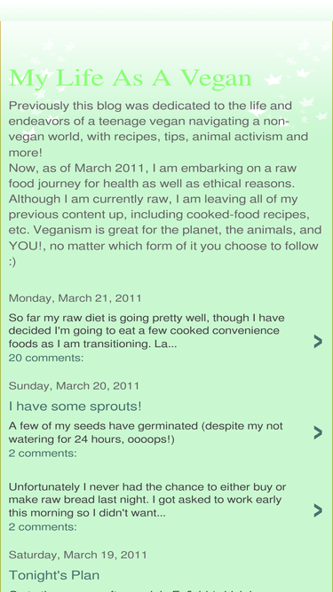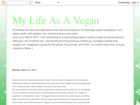75%previously this blog was dedicated to the life and endeavors of a teenage vegan navigating a non-vegan world, with recipes, tips, animal activism and more!now, as of march 2011, i am embarking on a raw food journey for health as well as ethical reasons. although i am currently raw, i am leaving all of my previous content up, including cooked-food recipes, etc. veganism is great for the planet, the animals, and you!, no matter which form of it you choose to follow :)
