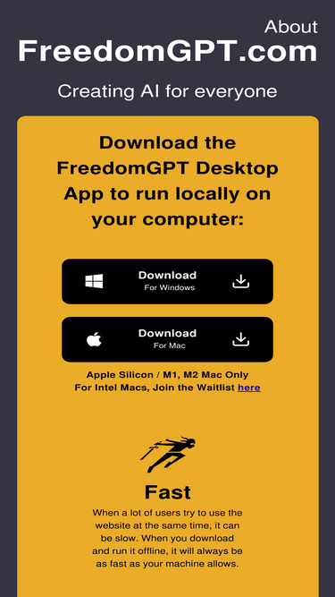 86%FreedomGPT is an uncensored AI app store providing access to the latest AIs. It is private, safe, secure and available on the browser and as native app on all major platforms.