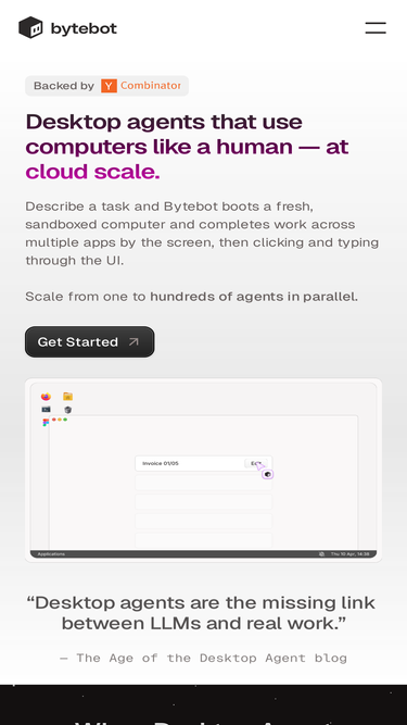 79%Describe a task and Bytebot boots a fresh, sandboxed computer and completes work across multiple apps by the screen, then clicking and typing through the UI. Scale from one to hundreds of agents in parallel.
