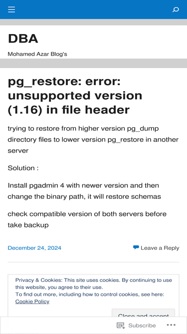 Mohamed Azar DBA , Riyadh, Kingdom of Saudi Arabia. Contact me : azar@mohamedazar.com Certification : Oracle 10g OCA, OCP OTN Forum Member Oracle Mix Group Join DBA Expert Oracle User Group Oradb…