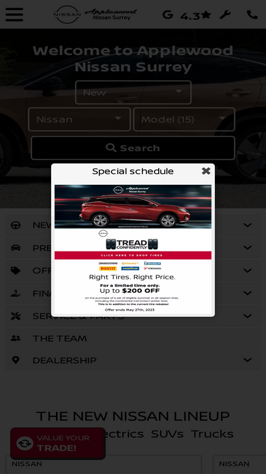 92%Discover unbeatable deals at Applewood Nissan Surrey, your trusted Nissan dealership. Explore our wide range of new and pre-owned Nissan models. Experience top-notch customer service, expert maintenance, and exclusive offers. Visit us today for your next Nissan adventure!