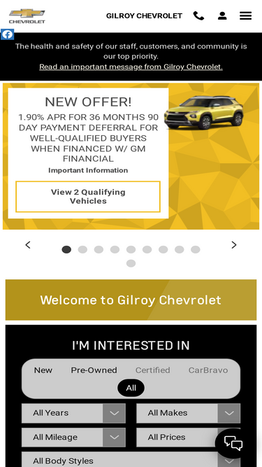 94%visit gilroy chevrolet in gilroy, ca, to learn more about our new chevy lineup and our chevrolet financing and leasing offers.