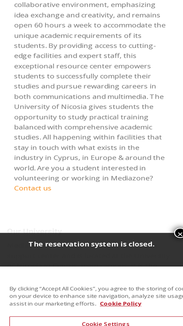 92%mediazone is a university of nicosia service support centre. we assume the responsibility and support for all of the facilities and equipment utilized by the communications department academic practical courses, as well as support the design & multimedia department, for the university of nicosia. we also produce creative audio/ visual/ print/ multimedia products for the university and its entities.