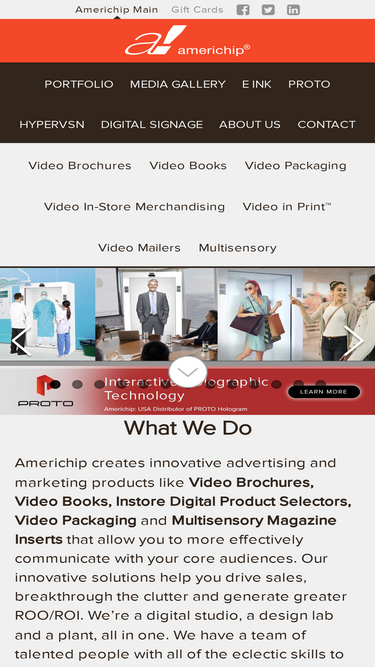 100%Americhip designs, develops, and manufactures innovative marketing & communication solutions that empower global brands and agencies with customized Video Direct Mail, Video Greeting Cards, Video Brochures, Video Books, Video Mailers, Paper Thin Video Cards, Video Magazine Inserts, Video Invitation Cards, LCD Greeting Cards, Video Magazine, Video Direct Mail, Direct Mail Marketing, Video Print Collateral, Video Books, Video Packaging, Video Point of Sale Display, Video POS display, Video Marketing Cards, Video Promotion Cards, Multi Sensory Video In Print, Direct Marketing Brochures, Promotion Video Players, Video Menus, Video Pads, Video Flyers, Video Sales Aids, Video Physician Mailers, Print Plus Video, Video Embedded in Print, Video Fused in Print, Printed Cards with Video, Video Marketing, Video Promotion, VideoPacks, Video Packs and other types of Multisensory advertising and marketing technologies.