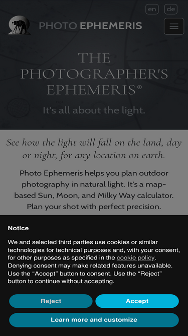 TPE hilft Ihnen bei der Planung von Outdoor-Fotografie bei natürlichem Licht. Sehen Sie, wie das Licht auf das Land fällt, Tag oder Nacht, für jeden Ort auf der Erde.