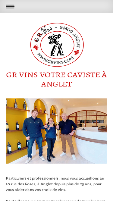 100%10, rue des Roses 64600 Anglet Tél. : 05 59 03 20 82 contact@grvins.com Commercial et relations fournisseurs Didier Petriacq 06 08 48 18 59 didier.petriacq@grvins.com Relations clients / fournisseurs et logistique Thomas Petriacq 06 81 76 83 35 thomas.petriacq@grvins.com Assistante administrative Valérie Fistarol 05 59 03 20 82 contact@grvins.com Nos horaires : Lundi : 9h00 à 12h30 Mardi : 9h00 à 12h30 / / 15 h 00 à 19h00 Mercredi : 9h00 à 12h30 Jeudi : 9h00 à 12h30 / / 15 h 00 à 19h00 Vendredi : 9h00 à 12h30 / / 15 h 00 à 19h00 Samedi : 10h00 à 13h00 Dimanche : Fermé Pour les prises de rendez-vous, contactez le 06 08 48 18 59 (Didier) ou au 06 81 76 83 35 (Thomas).