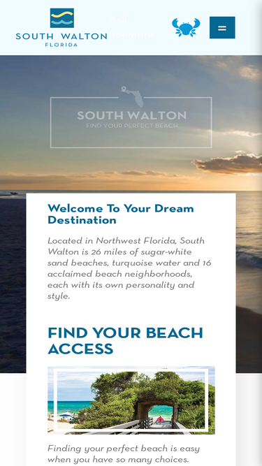 78%visit south walton. 26-miles of turquoise waters and sugar-white sand beaches in northwest florida. choose your perfect beach. 16 unique beach neighborhoods.