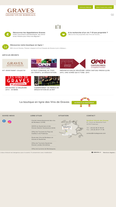 Syndicat viticole des Graves 61, Cours du Maréchal Foch 33720 Podensac Tél : +33 (5) 56 27 09 25 Fax : + 33 (5) 56 27 17 36 contact@vinsdegraves.com Pour recevoir l'actualité des Vins de Graves Cliquez ici