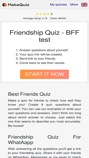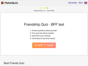 80%Create your own best friend quiz and see who knows you best! Test your friendships with fun, personalized questions.