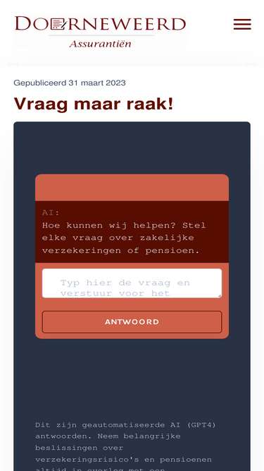 De informatie en formulieren op deze website zijn niet meer toegankelijk. Doorneweerd Assurantiën zal vanaf 1 september 2025 niet meer adviseren over