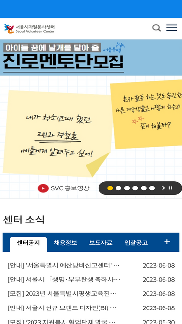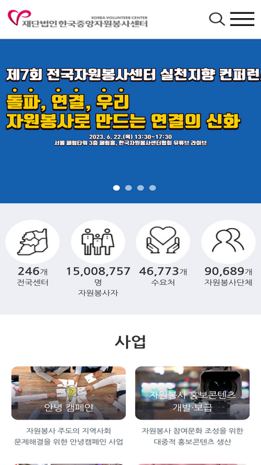 100%재단법인 한국중앙자원봉사센터, 센터소개, 주요사업, 자원봉사 정책, 채용정보 등 제공.